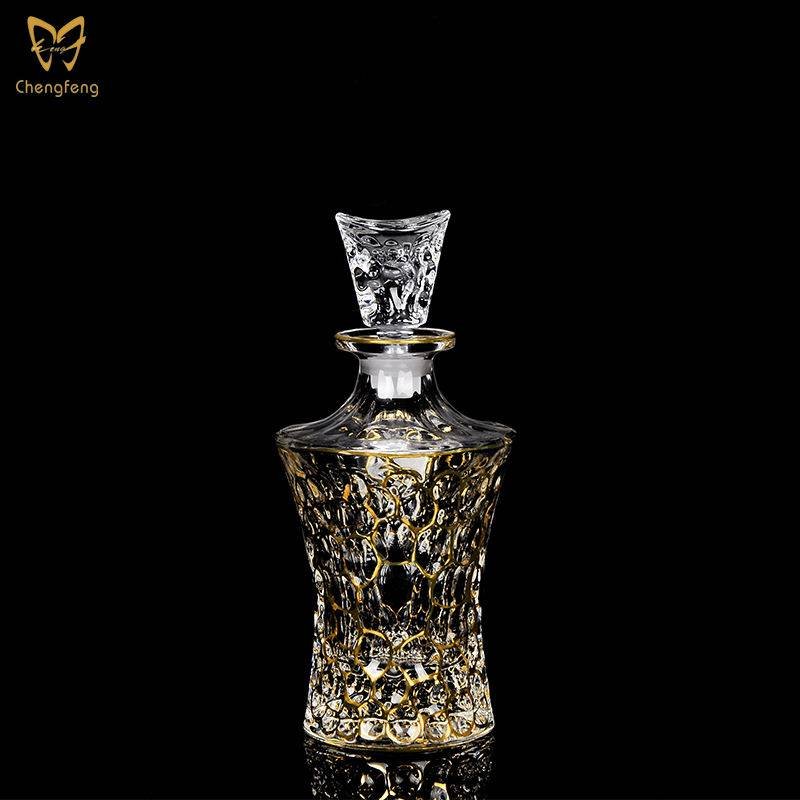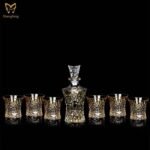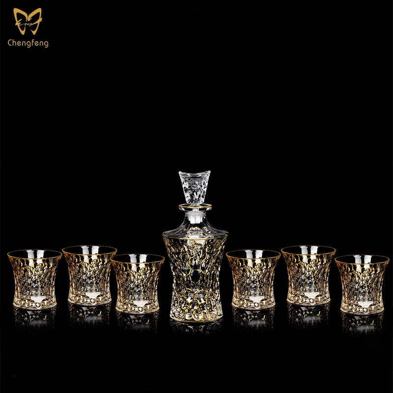 Includes 1 whiskey decanter and 6 double old fashioned glasses.Crafted of sparkling crystal material, featuring an elegant gold rim design.